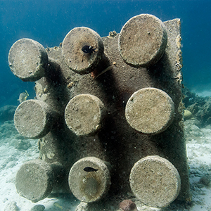 Below are some photos of an underwater sculpture, at this site at a depth of about 20 feet, depicting Bonairian cooking implements that was dedicated in June of 2008. It didn't take long for reef fish to take over the structure according to this