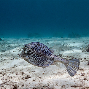 The second Frogfish photo shows its lure. The photo at the far right shows a Parrotfish munching on coral with blue stovepipe sponge in the background. Below - Hawksbill Turtle, Spanish Hogfish and Trunkfish. Our afternoon dive was in front of the Bellafonte.