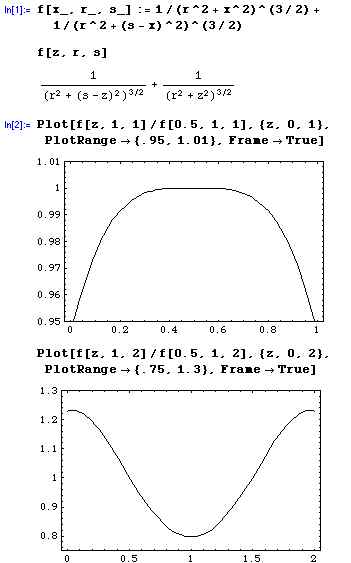 r = s = 1 and then r = 1 and s = 2. Note that in the first plot the vertical scale goes from 0.95 to 1.01 and in the second plot the vertical axis goes from 0.75 to 1.3. So doubling the separation from the ideal case causes quite a variation in the field along the zxis.This Mathematica Notebook [helmholtz.nb] shows you how to calculate the higher order derivatives using the D[f[x],{x,n}] function. The algebra can get messy. And the relevance of the first three derivatives vanishing at the center can be appreciated by considering the Taylor series expansion of the field about the center point. For those who need and intro or a refresher, please look at this website about the Taylor series Derivation.