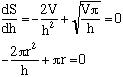 To find the minimum S, differentiate the above with respect to h and set the resulting expression equal to zero and then solve for h: