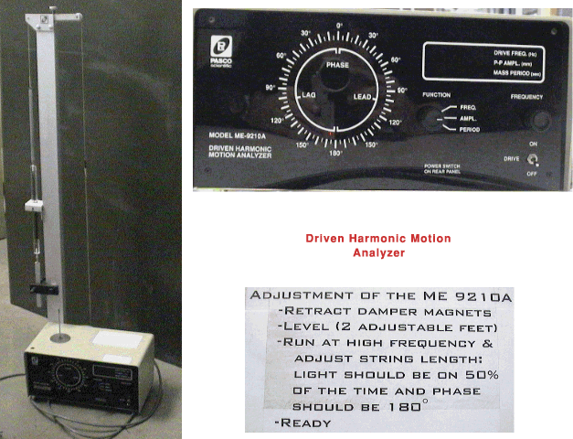 Overview:In this lab you will analyze the motion of a driven harmonic oscillator. The apparatus is shown below. More details are given in the manual that comes with the apparatus. The goal of this lab is to collect data with the apparatus, mapping out the amplitude of oscillation and phase as a function of driving frequency.