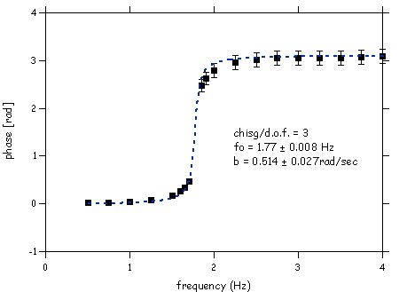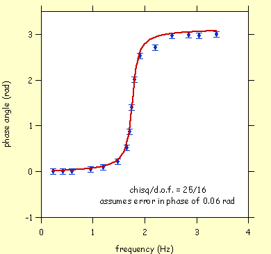 These plots were made with IGOR. When I analyzed the data I did a curve fit to the ampliture vs frequency and phase angle vs frequency dependences. The functions I used (in the Procedure window) are shown below. The results of the fits are shown in the plots.