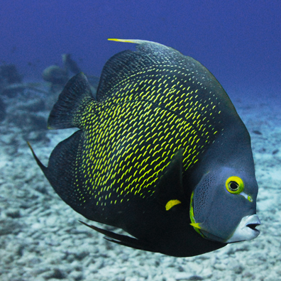 From top to bottom and left to right: French Angelfish, Four-eye Butterfly, Jacks, Spanish Hogfish, Parrotfish, Pufferfish, Scorpionfish, Flamingo Tongue. More Bonaire photos in